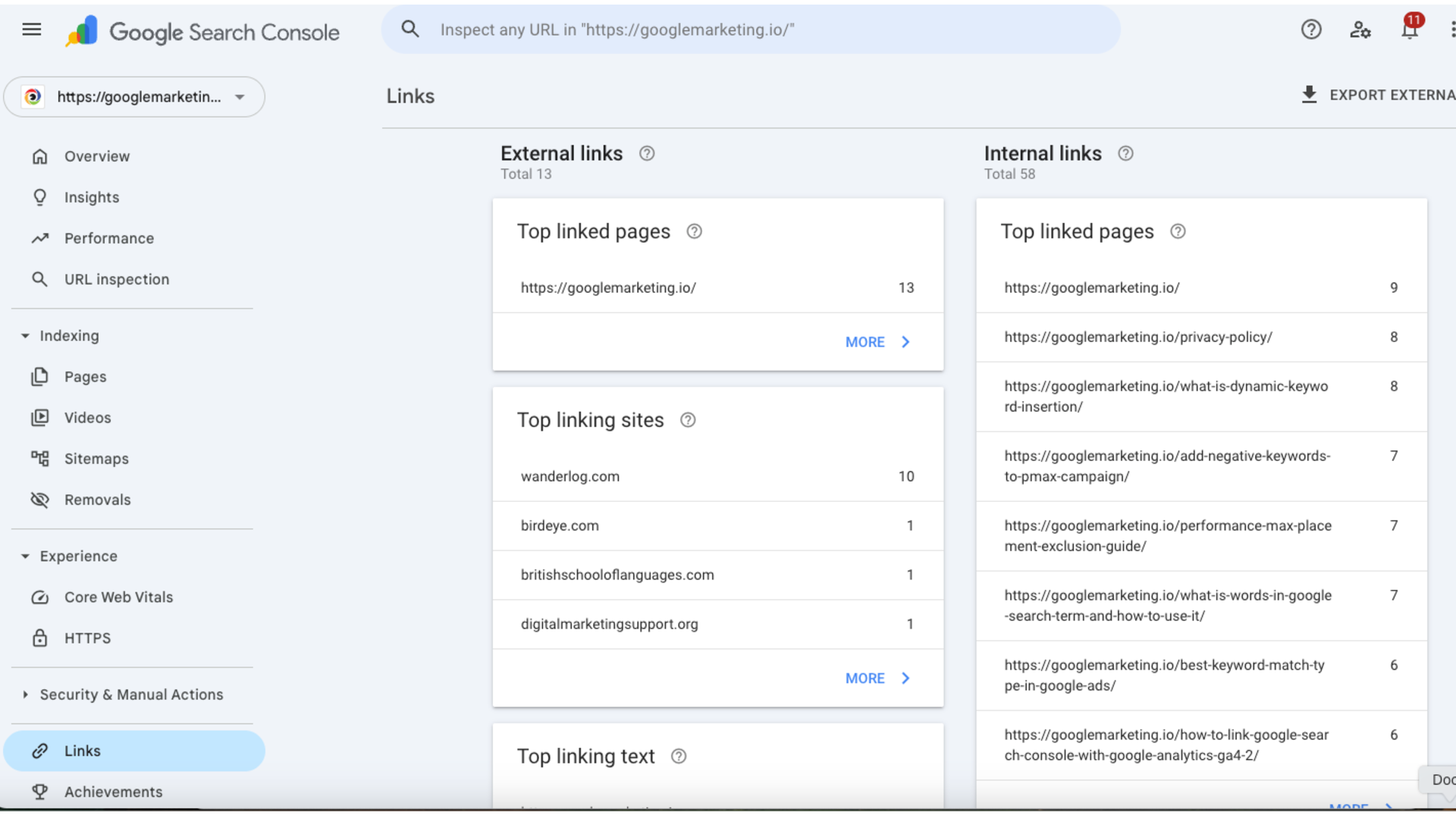 Google Search Console makes it easy to check backlinks for free. While it doesn’t provide as much data as premium tools like Ahrefs or SEMrush, it shows the most important links recognized by Google.
